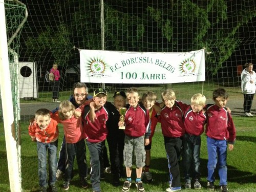 Am Freitag waren wir in Bad Belzig zum Flutlichtturnier eingeladen, welches im Rahmen der 100 Jahr Feier der dortigen Borussia ausgetragen wurde. Leider gab es etliche Absagen, so das wir nur 3 Mannschaften waren. Es wurde eine Doppelrunde mit Hin- und Rückspiel ausgetragen. Es standen je 2 Spiele gegen Borussia Belzig1 und Borussia Belzig 2 an. Eine Partie dauerte 15 Minuten. Was auffiel war, daß auch in Brandenburg Abschläge über die Mittellinie abgepfiffen werden!! Da scheint es nur eine Mannschaft bei uns zu geben, die eigene Fußballregeln hat.Das Flutlicht brannte schon. Im ersten Spiel trafen wir auf die Vertretung von Belzig1. Hier wurde gegen einen starken Gegner gespielt. Es war ein enges Spiel mit Chancen auf beiden Seiten. Am Ende gewannen wir knapp aber nicht unverdient mit 1:0. Im zweiten Spiel gegen Borussia2 sollte es für uns schwerer werden. Wir hatten wieder klarste Chancen und trafen einmal die Latte und den Pfosten. Leider wollte der Ball nicht ins Tor. Erst als wir mit 0:1 hintenlagen nutzten wir die Chance zum 1:1. Wir hatten das Spiel klar in der Hand, lagen nach einer Ecke auf einmal wieder hinten. Doch auch diesmal kamen wir zurück und erzielten den Ausgleich. In der verbleibenden Zeit wollte uns der Siegtreffer nicht mehr gelingen. Nach einer Pause begannen wir mit der Rückrunde. Es war jetzt schon dunkel und der Spass unter Flutlicht zu spielen war allen anzumerken (auch den Eltern). Im Spiel gegen Belzig 1 hätte uns ein Sieg zum vorzeitigen Turniersieger gemacht. Leider gibt es im Fußball kein hätte, sondern nur die Wahrheit. Und die liegt auf dem Platz. Wir begannen konzentriert ohne aber die Chancen zu verwerten. Ein Weitschuß vom linken Strafraumrand schlug bei uns ein und wir liefen wieder einem Rückstand nach. Wir spielten stark, ließen den Ball laufen und erspielten uns Chancen. Als uns die Zeitlangsam davon zu laufen drohte, nutzten wir die zu defensive Einstellung der Gastgeber noch zum Ausgleich. Nun mußten wir uns den Turniersieg im letzten Spiel erkämpfen. Das taten die Jungs und das Mädchen nicht, sondern sie erspielten sich den Turniersieg. Es gelang uns mit sehenswerten und tollen Spielzügen ein 5:0 zu erzielen. Somit war der 1. Platz unser. Als wir den Pokal kurz nach 23:00Uhr bei der Siegerehrung erhielten war die Freude bei en Kindern groß und es wurde ausgelasssen gejubelt. Somit sind wir erfolgreich in die Sommerturnier-Saison gestartet.Für Einheit spielten:Sophia, Christian, Jassin, Louis(2), Paul R.(2), Malte(1), Paul H.(4), Tom und Hannes.Noch ein schönes Wochenende wünschenEure Trainer