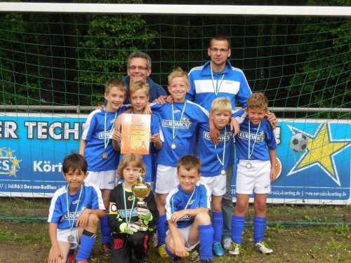 Wir waren am Samstag zu Gast beim 3.Stadtwerke-Cup von Chemie Rodleben in Roßlau. Es wurde in 2 Gruppen mit 4 Mannschaften gespielt und ein Spiel dauerte 15 Minuten.Unser erster Gegner von SG Empor Waldersee machte uns das Leben sehr schwer. Wir schafften es nicht die Überlegenheit auszunutzen. Fast immer hatte ein Gegner noch ein Körperteil am Ball oder wir vergaben die Möglichkeiten zu überhastet. Erst kurz vor dem Ende erzielten wir den Siegtreffer. Das 2.Spiel gegen FV Bad Düben begannen wir ohne Pfiff. Wir kamen nicht ins Spiel und lagen schnell mit 0:1 hinten. Auch hier erzielten wir mit Glück das 1:1 kurz vor Ende. Das letzte Vorrundenspiel gegen BSV Vorfläming Deetz konnten wir mit 2:0 gewinnen, hatten aber noch zahllose Chancen, die normalerweise nicht am Tor vorbeigeschossen werden können. Somit zogen wir als Gruppenzweiter neben Bad Düben ins Halbfinale. Dort wartete der bis dahin noch ungeschlagene (auch ohne Gegentor) Veranstalter aus Rodleben auf uns. Dieses Spiel hatten wir klar im Griff und zogen durch ein 4:0 ins Finale ein. Hier waren die Kickeraus Bad Düben wieder unsere Gegner. Nach einem ausgeglichenem Spiel stand es am Ende 1:1. So wurde die Entscheidung vom Punkt gesucht. Nach einem spannendem 9-Meter.Schiessen sicherte sich die Mannschaft aus Bad Düben den Turniersieg durch ein3:2. Gratulation an die Mannschaft von der Mulde. Wir haben gegen Ende des Turniers noch die Kurve bekommen und uns den 2.Platz gesichert.Wir danken den Verantwortlichen aus Rodleben für die Einladung zum Turnier. Wir waren gern da und es hat allen Spass gemacht. Nach der Siegerehrung machten wir uns auf den Weg zum nächsten Turnier nach Leipzig, wo wir auch unser Nachtlager aufschlugen.Für den SV Einheit spieltn:Sophia, Christian, Jassin, Malte(1), Louis, Hannes, Quentin(7), Tilmann, Ben(1), Tom.