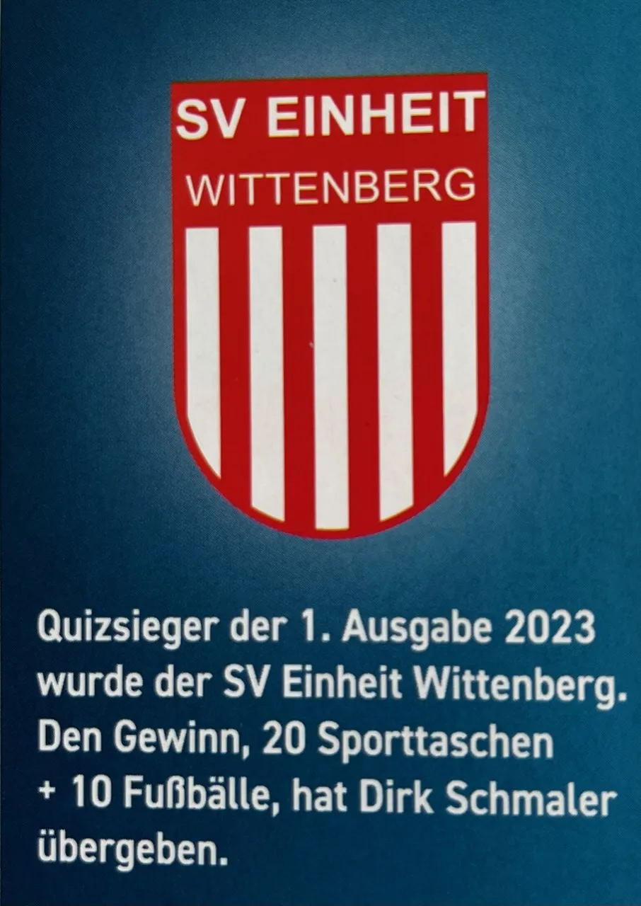Überraschung für den SV Einheit Wittenberg. Zum dritten Mal in den 8 Jahren seit Gründung der 3. Halbzeit durch Dirk Schmaler und Ingo Mattheuer konnte unser Verein als Quizsieger den Gewinn von 20 Sporttaschen und 10 Fußbällen entgegennehmen. Wir bedanken uns ganz herzlich bei den Herausgebern der 3. Halbzeit ,der Sportagentur Wittenberg, die es auch in der 25. Ausgabe der 3. Halbzeit wieder verstanden haben, tolle Vereinsinformationen aus der Fußballregion Wittenberg und Anhalt auf Hochglanz zu präsentieren. Für Besucher des Heimspiels SV Einheit vs. Prettin liegt die aktuelle Ausgabe der 3. Halbzeit kostenlos zum Mitnehmen an der Stadionkasse bereit.